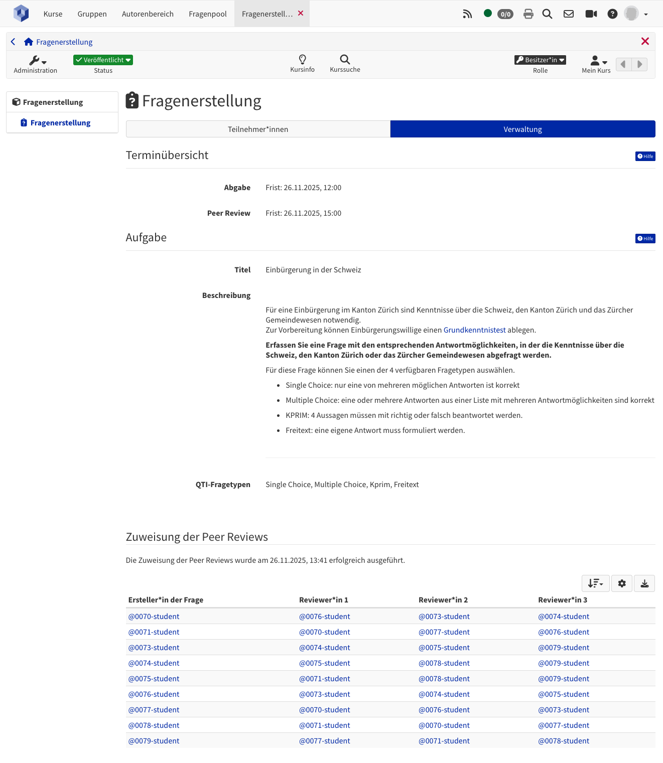Sobald die Bedingungen erfüllt sind, kann der/die Kursbesitzer*in die Zuweisung der Peer Reviews vornehmen.