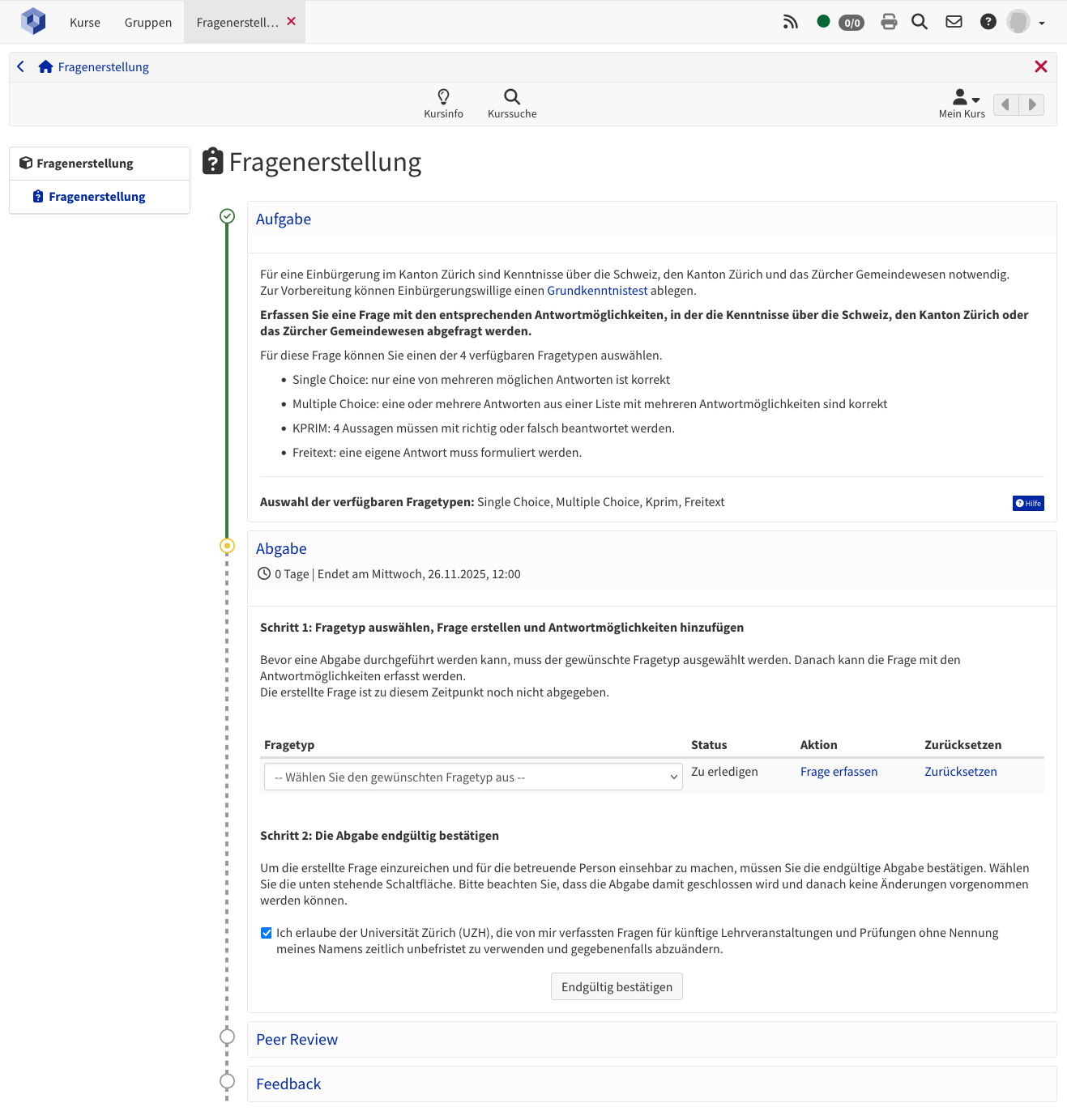 Beim Peer Review beurteilen die Teilnehmenden die abgegebenen Fragen gegenseitig. Nach dem Peer Review kann das Feedback zur eigenen Frage eingesehen werden.