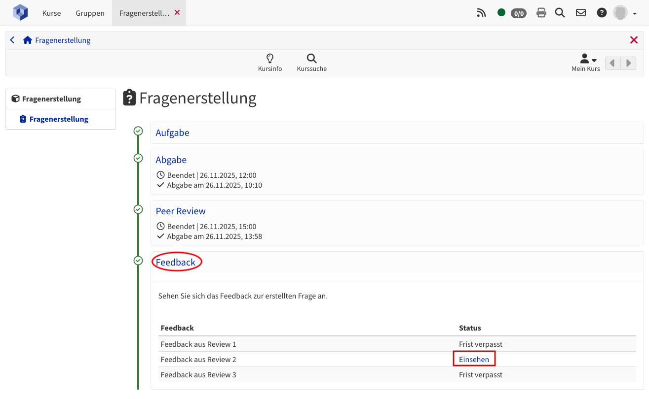 Sobald ein*e Teilnehmer*in den Peer Review abgeschlossen hat, können bereits vorhandene Feedbacks zur selbst erstellten Frage eingesehen werden.