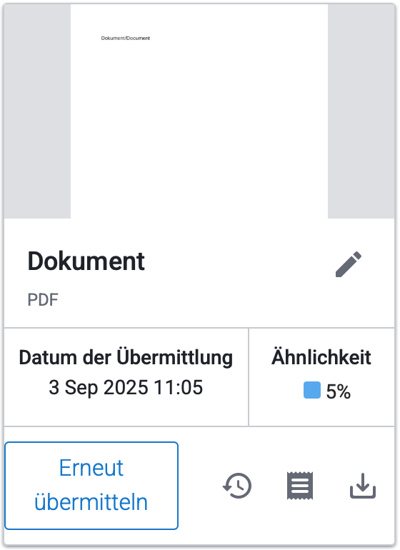 - Erneut übermitteln: Sie können ein Dokument mehrmals hochladen. Dabei wird stets nur die neueste Version gespeichert (frühere Versionen werden überschrieben). Ihre Übermittlungshistorie finden Sie über das "Uhr/Pfeil-Icon".