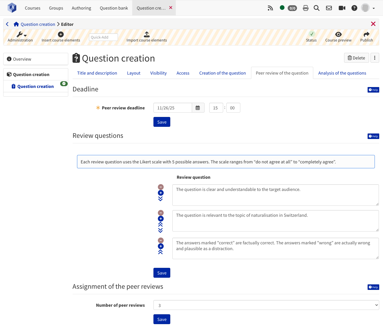 The questions created by the course participants are then anonymously evaluated in a peer review by other course participants.