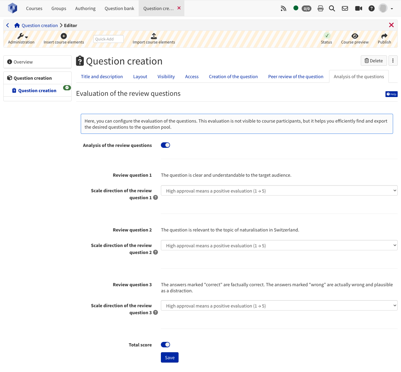 If the "Total score" option is activated, for every created questions a mean value of its review ratings is calculated.