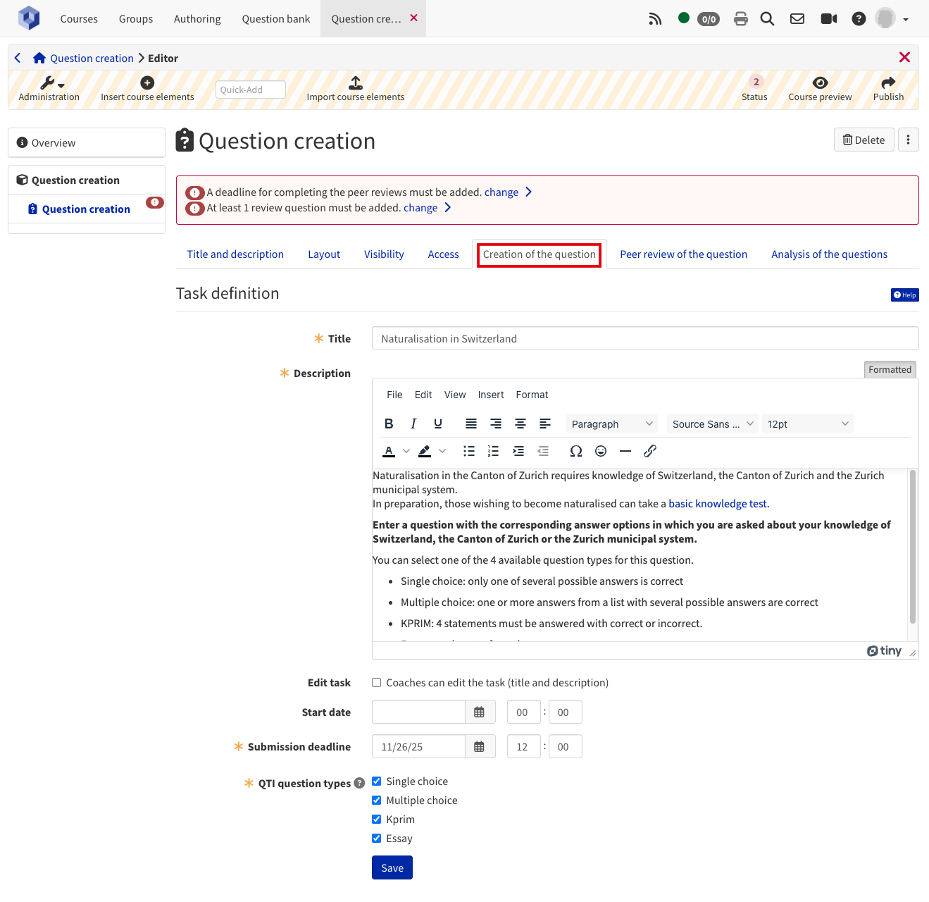 - Submission deadline: Enter the deadline for submitting the task (creation of the question).