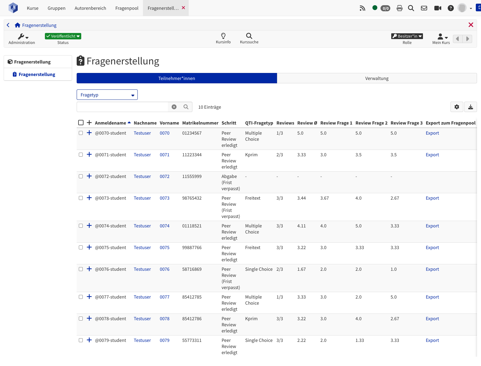 Markieren Sie dazu in der Teilnehmer*innen-Tabelle eine oder mehrere Zeilen und wählen Sie "Export zum Fragenpool" oder klicken Sie in der gewünschten Zeile den Link in der Spalte "Export" an.