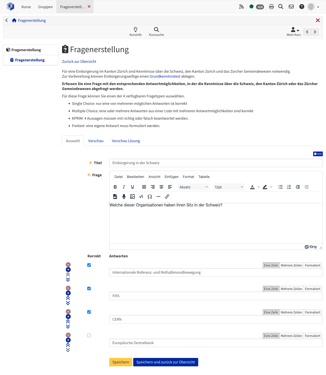 Frage beantworten: Zuerst lesen und beantworten die Teilnehmenden die ihnen zugewiesene Frage. Nach dem Speichern der Antwort wird angezeigt, welche Antworten der*die Fragensteller*in als richtig definiert hat.