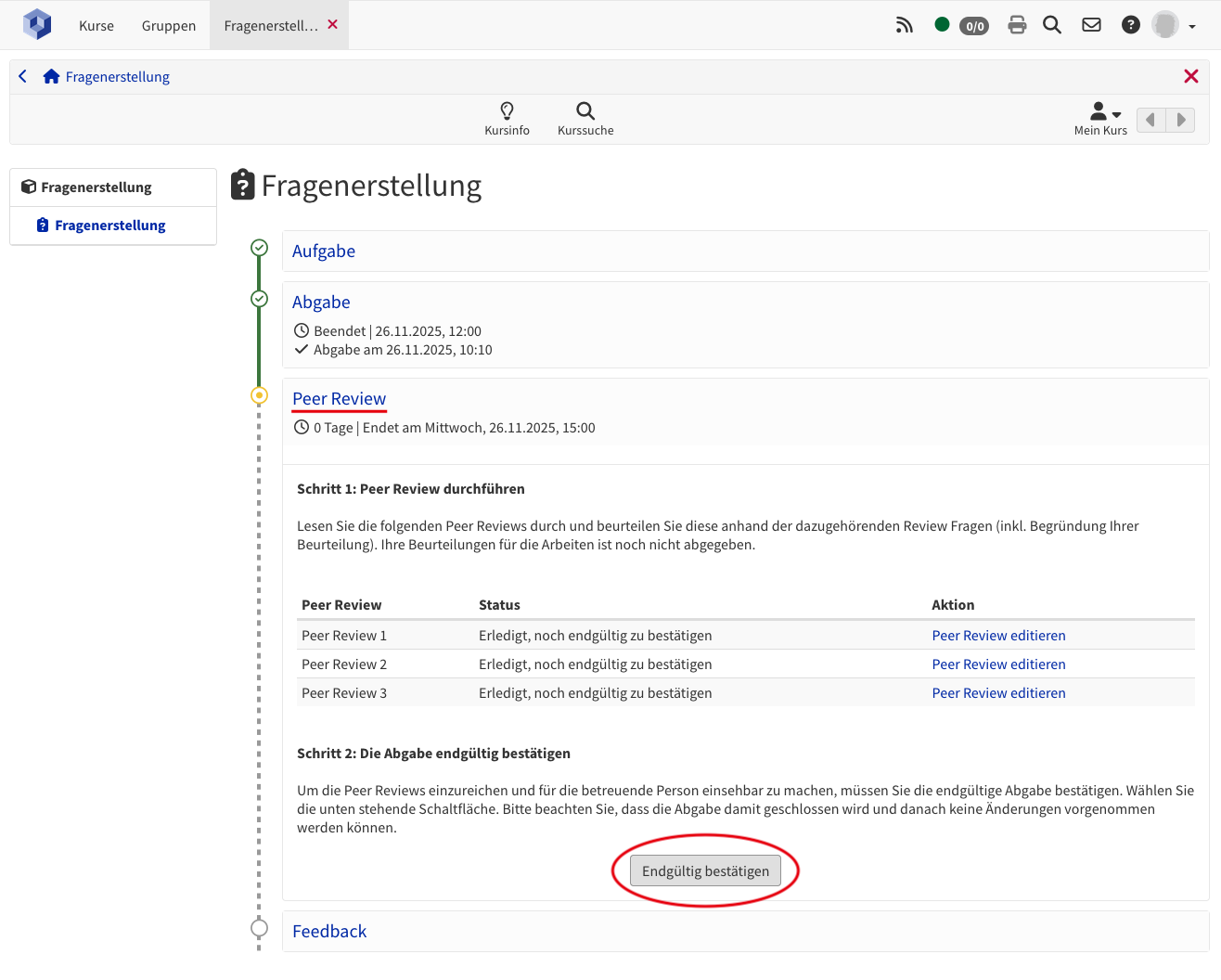 Peer Review Endgültig bestätigen: Sobald alle Reviews bearbeitet wurden, den Schritt "Peer Review" in der Übersicht mit "Endgültig bestätigen" abschliessen.