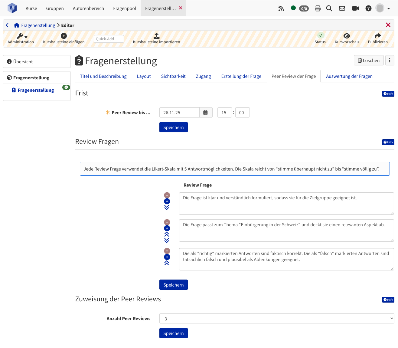 - Peer Review bis … : geben Sie die Frist für die Abgabe der Peer Reviews ein.